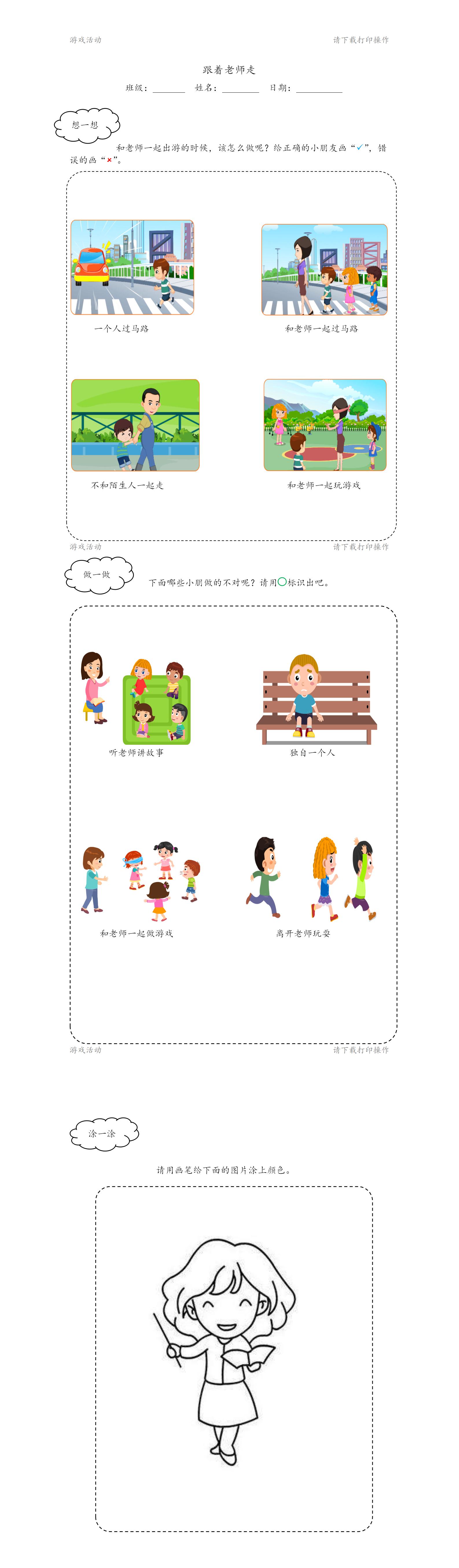 1、知道不能随便离开老师和集体,加强幼儿的安全意识。